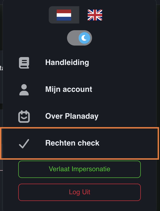 Je kan dit vinden in de dropdown menu rechts boven (1) en dan “rechten check“ (2)