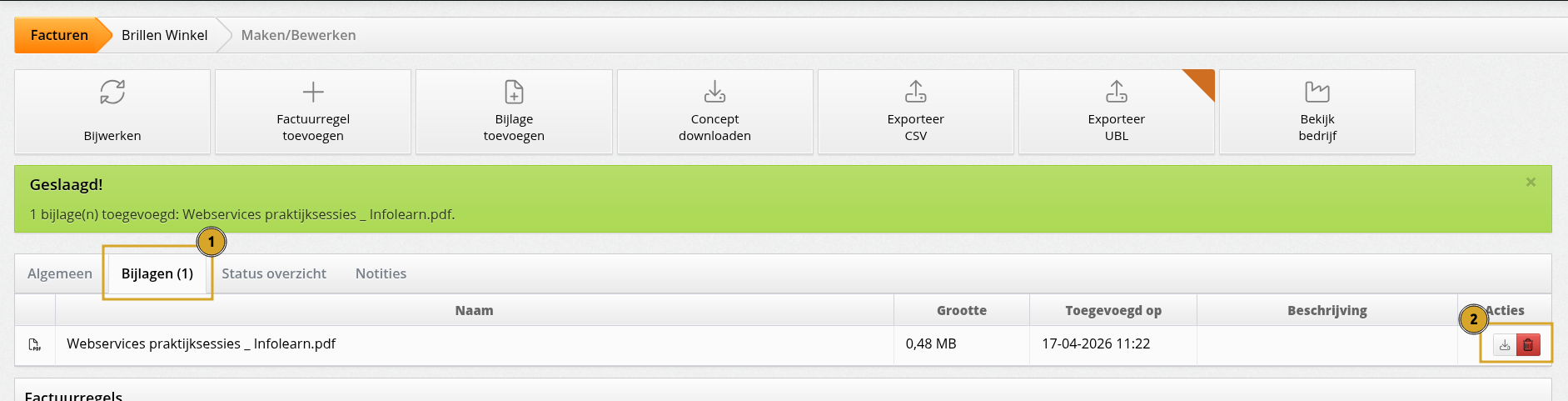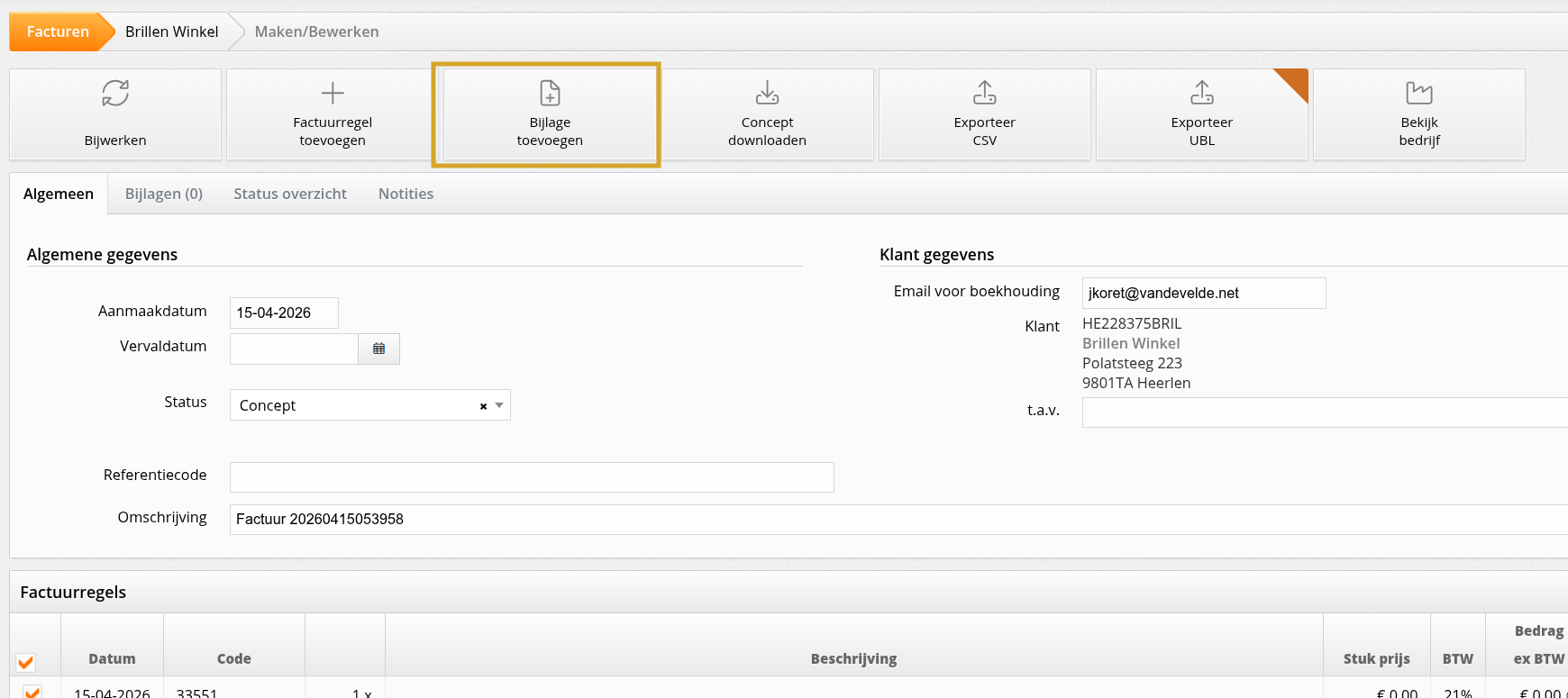 Bijlagen toevoegen en verwijderen kan alleen zolang de factuur nog in concept staat. Zodra een factuur verstuurd of naar de boekhouding geüpload is, blijven bestaande bijlagen zichtbaar maar zijn ze niet meer aan te passen.