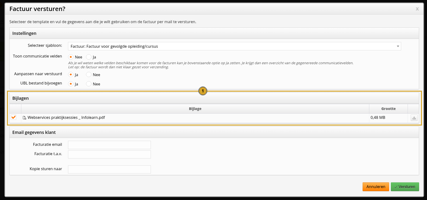 In het verstuurscherm van de factuurmail zie je voortaan een lijstje met al je bijlagen. Standaard staan ze allemaal aangevinkt; uitvinken haalt een bijlage uit de mail. Een teller laat zien hoeveel MB je in totaal meestuurt, en de verzendknop blokkeert automatisch als het totaal boven de 25 MB komt