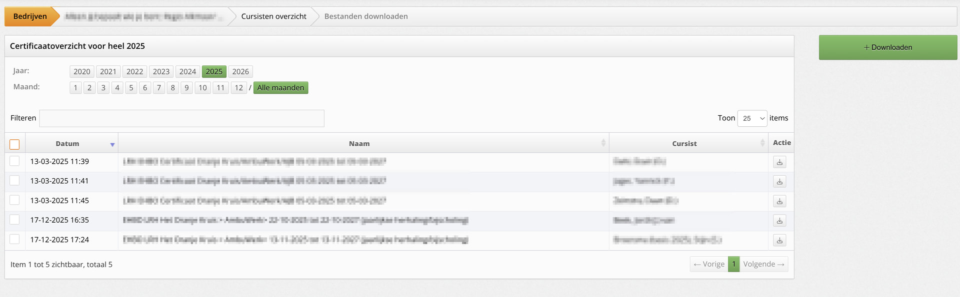 Je kan filteren op jaar en maand (of alles) en dan vinkjes zetten welke certificaten je wil downloaden. Ook kan je in het overzicht zelf per certificaat downloaden.