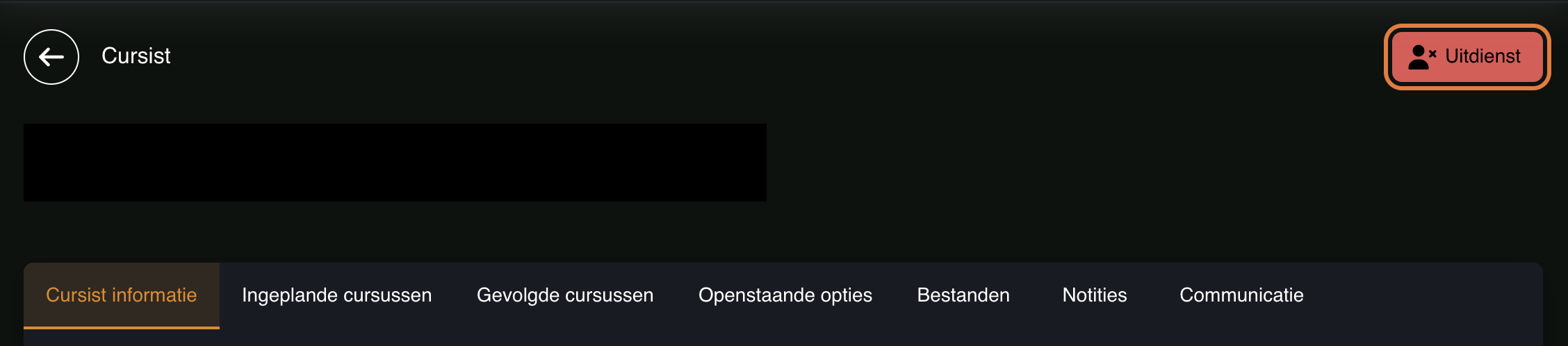 Je kan een cursist uitdienst nemen door de knop rechts boven