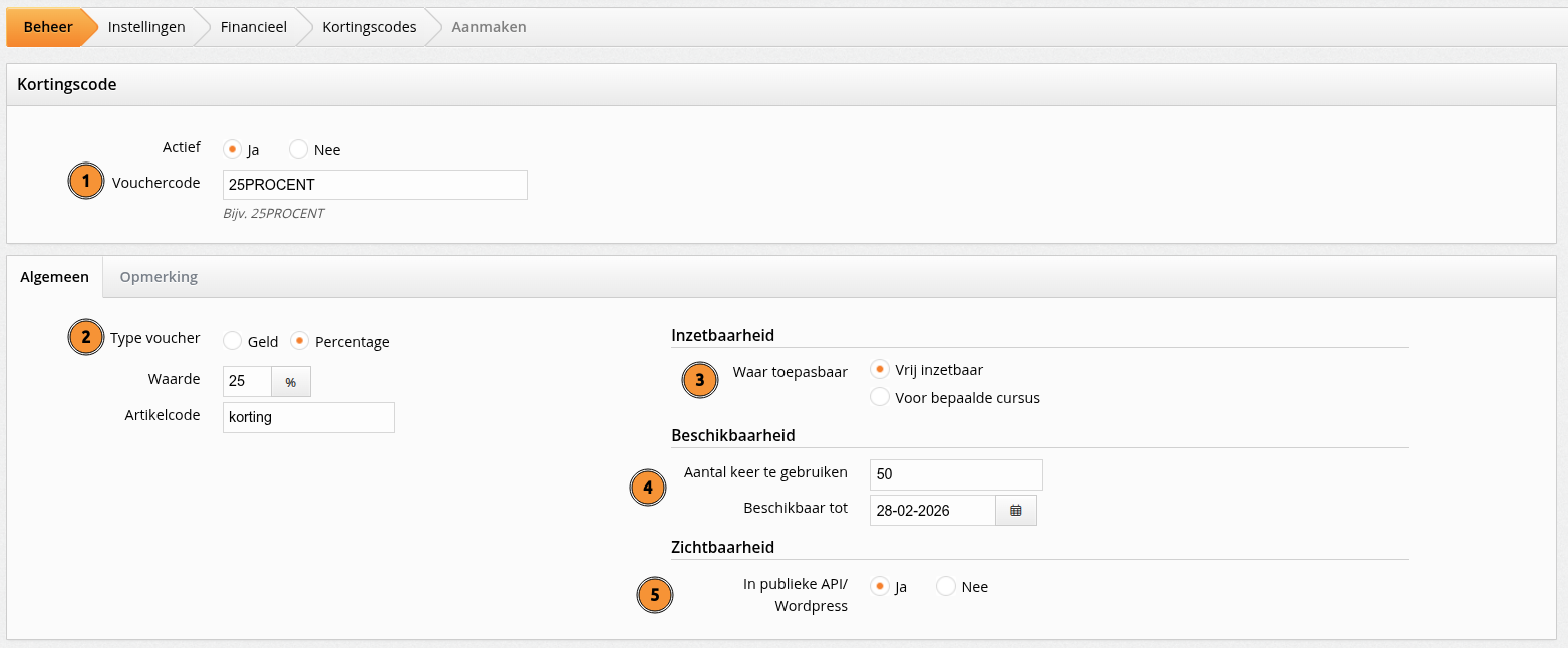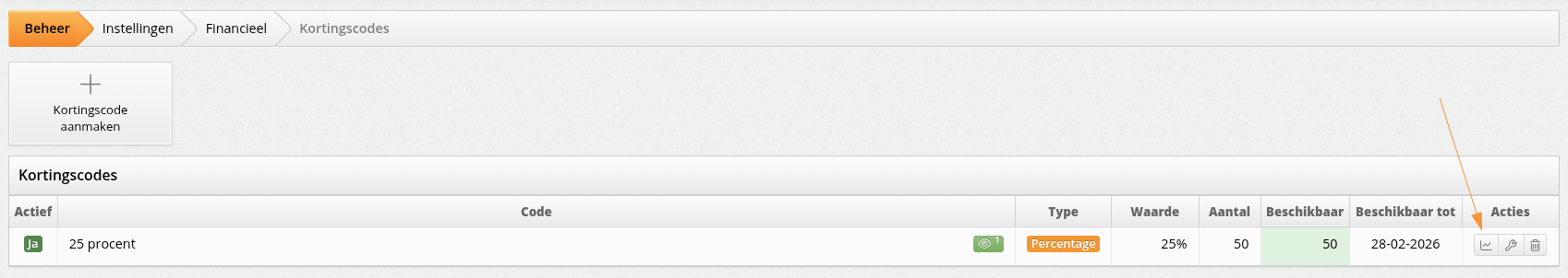 Ga naar Beheer → Instellingen → Financieel → Kortingscodes