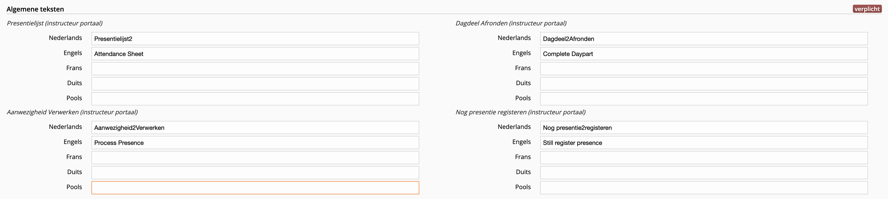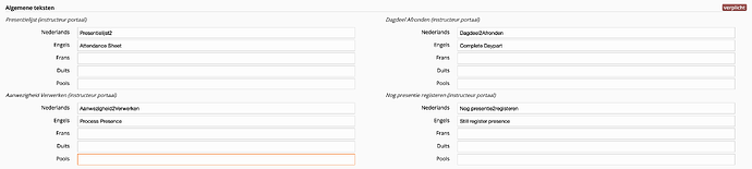 Het is nu mogelijk via de backoffice applicatie om de teksten van de presentie knoppen aan te passen voor het instructeur portaal.