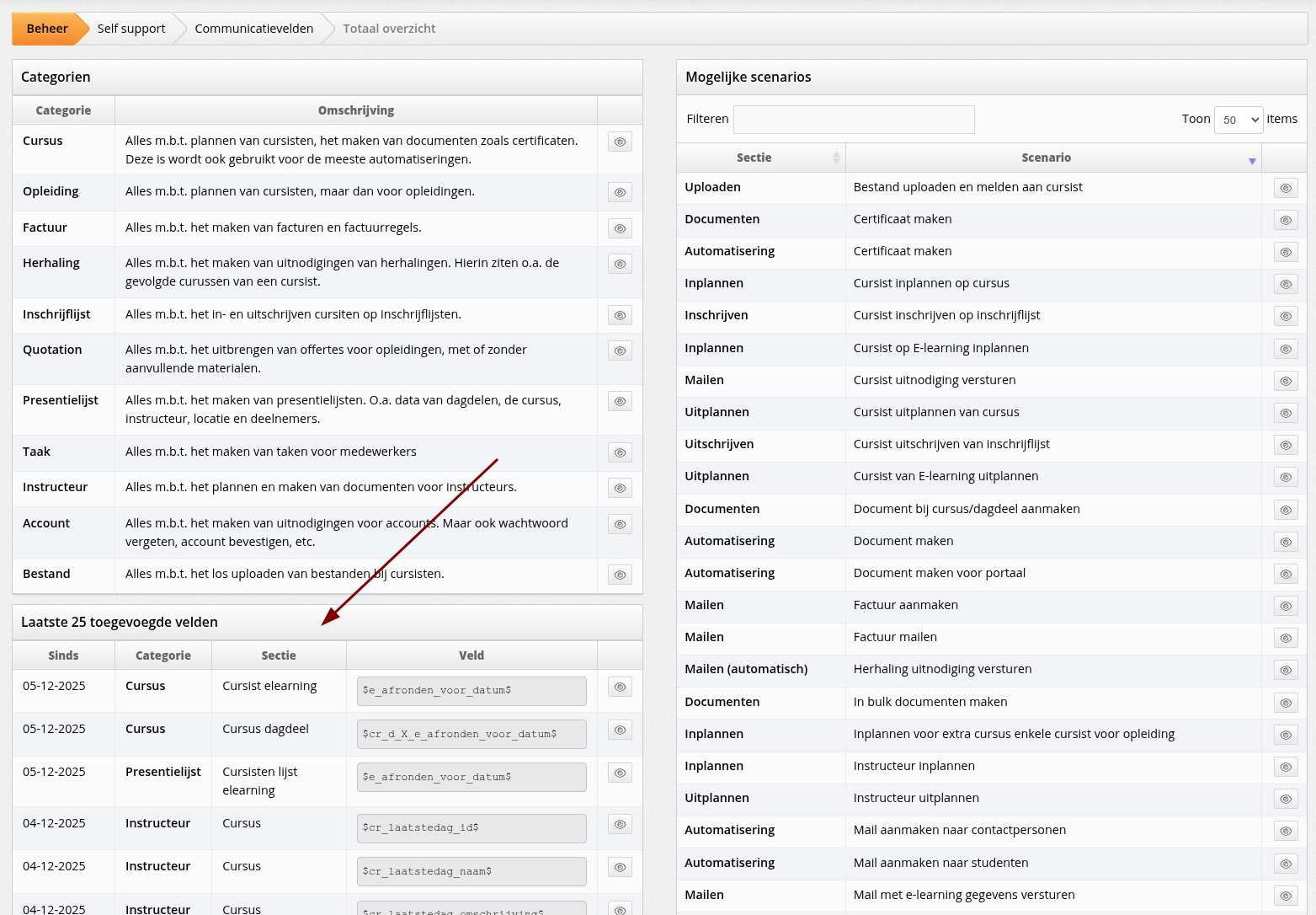 Deze velden kan je altijd vinden bij: beheer → selfsupport → beschikbare communicatievelden. En wist je dat je hier onderaan altijd een overzicht kan vinden van de laatst toegevoegde velden?