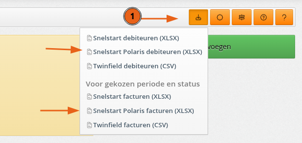 - Snelstart Polaris debiteuren (XLSX) — exporteert al je actieve debiteuren in het formaat dat Snelstart Polaris verwacht.