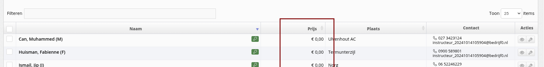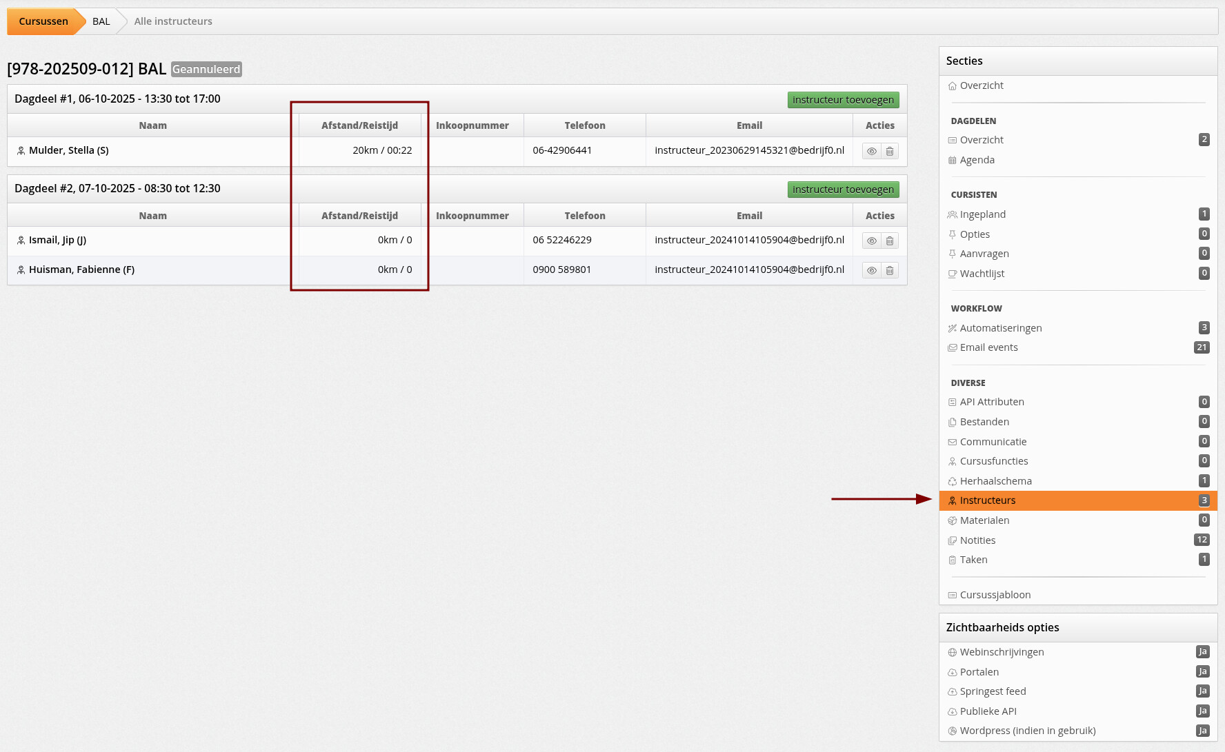 Bij ingeplande instructeurs onder een cursus/dagdeel