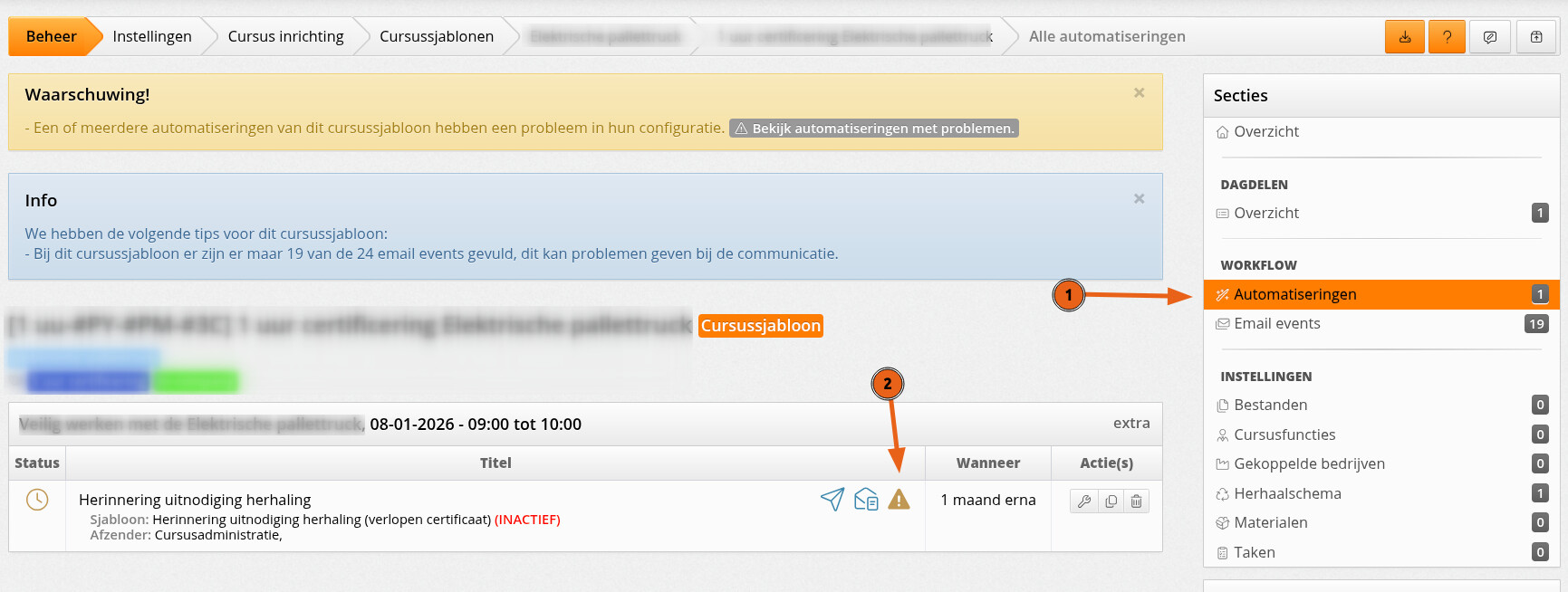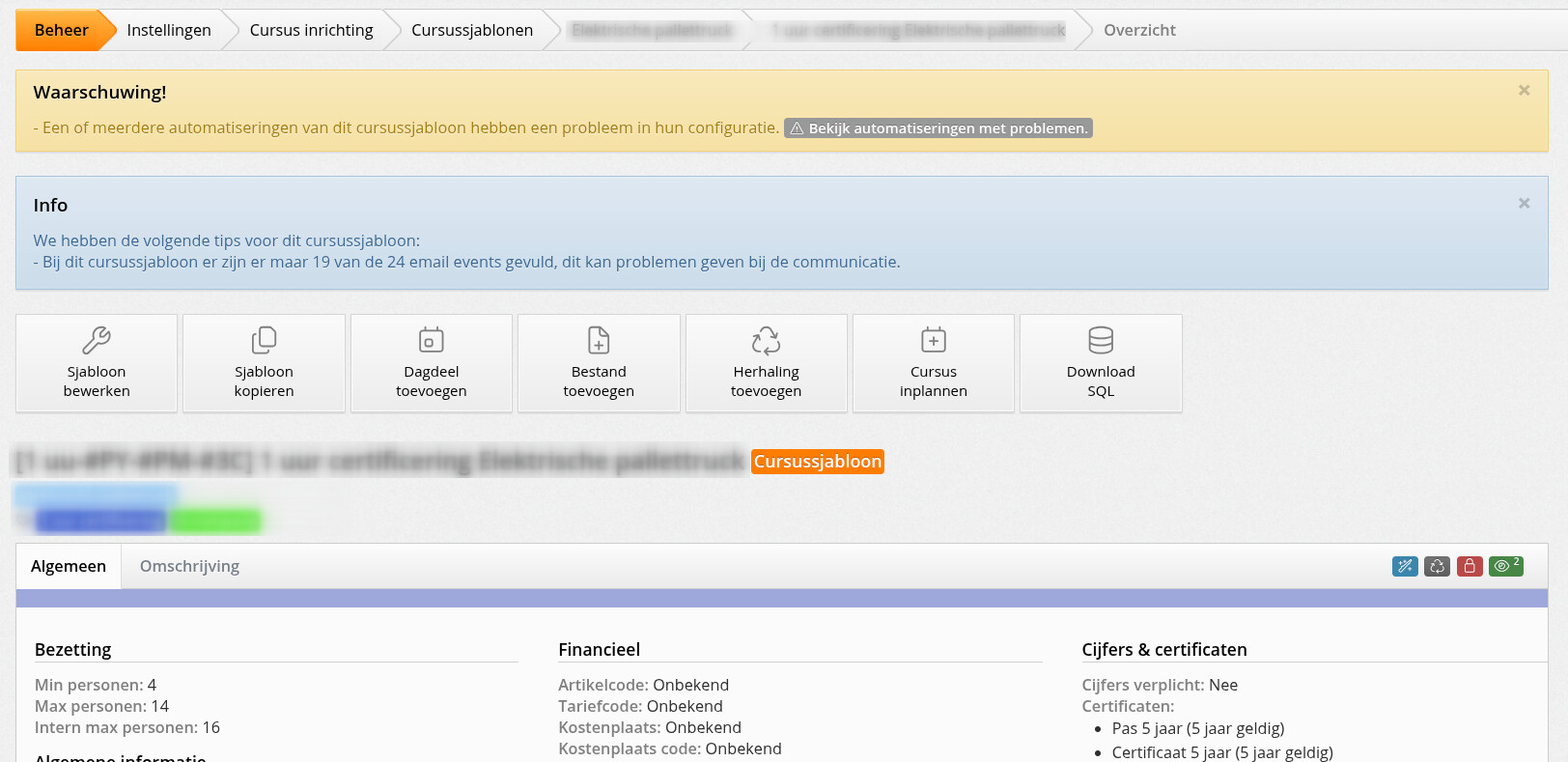 Als je bij het specifieke cursussjabloon kijkt, zie je nu ook meteen een melding staan:
