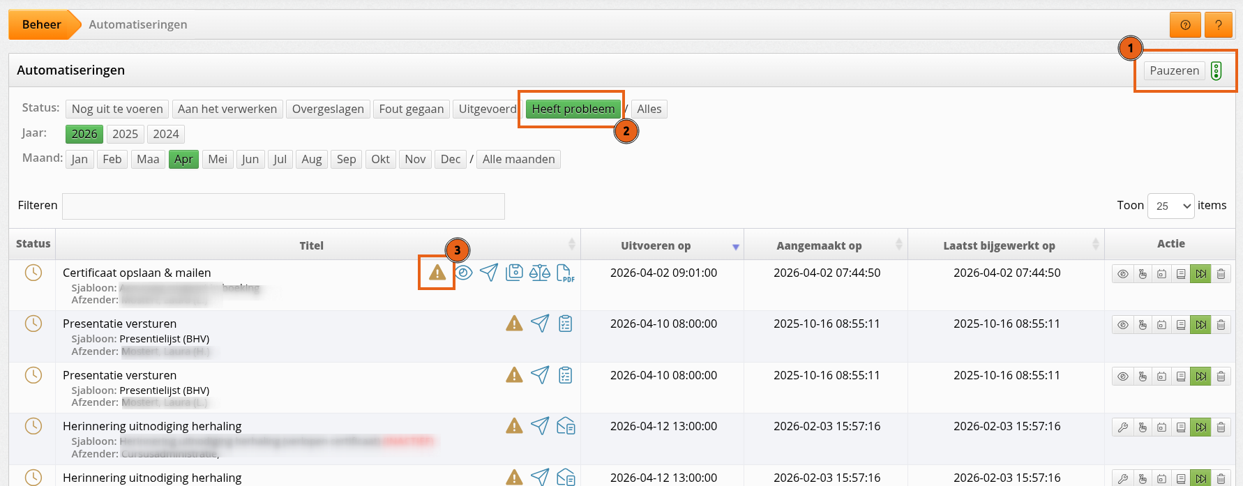Zo kan Je nu tijdelijk je automatiseringen pauzeren (1) met de knop rechtsboven in het overzicht. Soms is dat wel eens handig!
