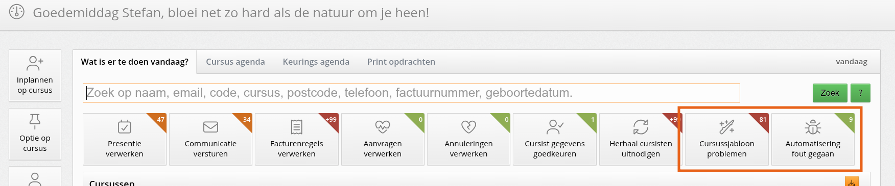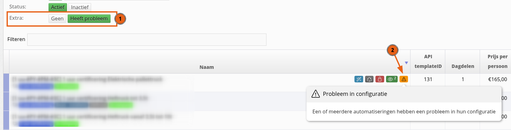 In het cursussjabloon (Beheer->instellingen->cursussjablonen) overzicht hebben we ook een nieuw filter toegevoegd: ‘Heeft problemen’