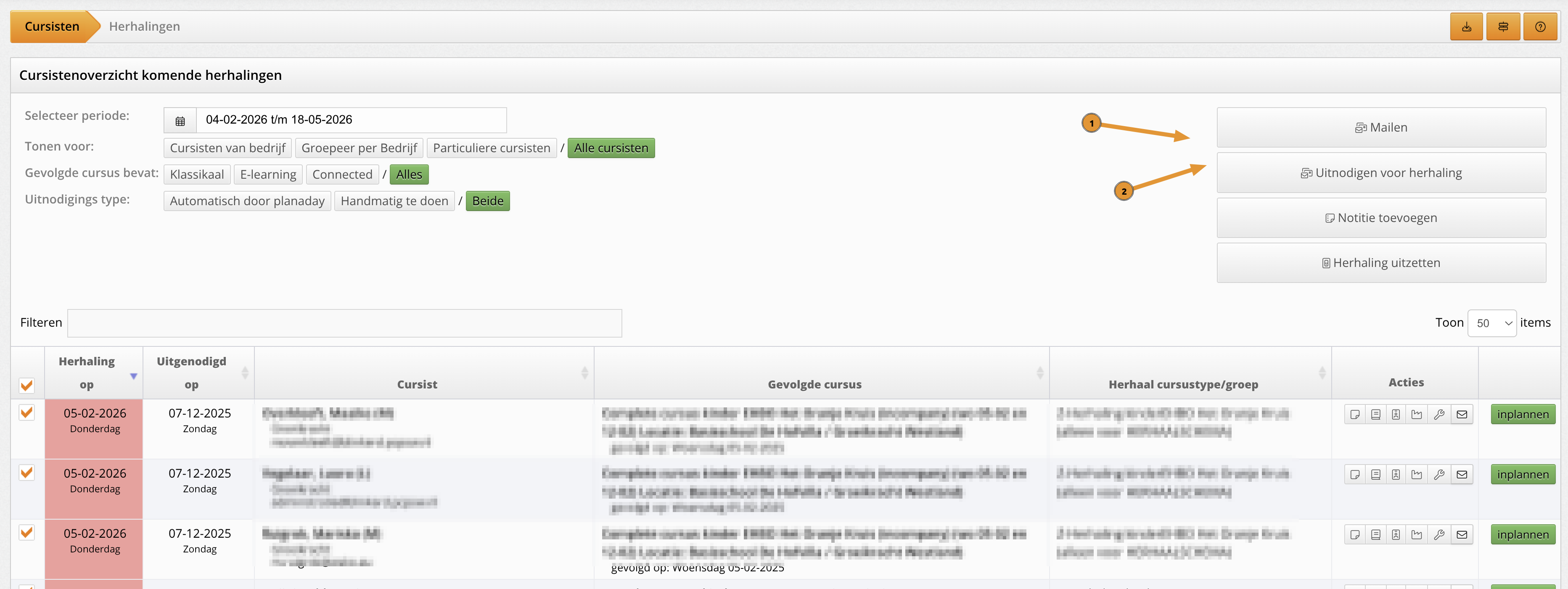 Uit het herhalingen overzicht (Cursisten → herhaling of het herhaal overzicht bij een bedrijf) was het al mogelijk om mails te sturen met de ‘standaard’ ingestelde mails voor herhalingen.