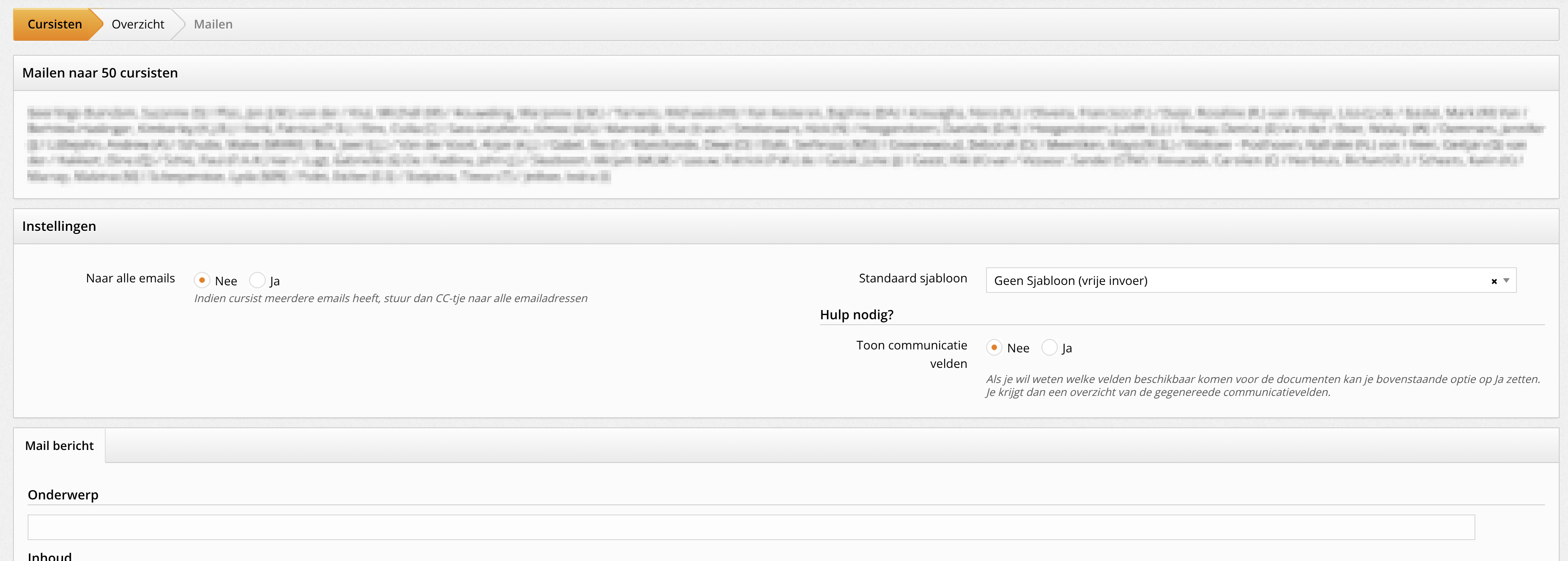 Nu is het ook mogelijk om zelf de cursisten te selecteren en dan een mail sjabloon te kiezen. Maakt je wat flexibeler in de communicatie!
