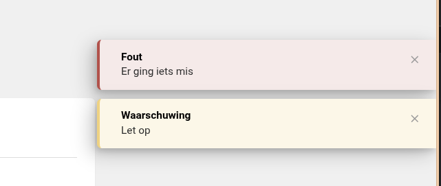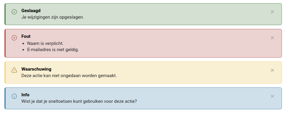 Meldingen kan je sluiten middels het kruisje rechtsboven, indien een melding niet automatisch sluit.