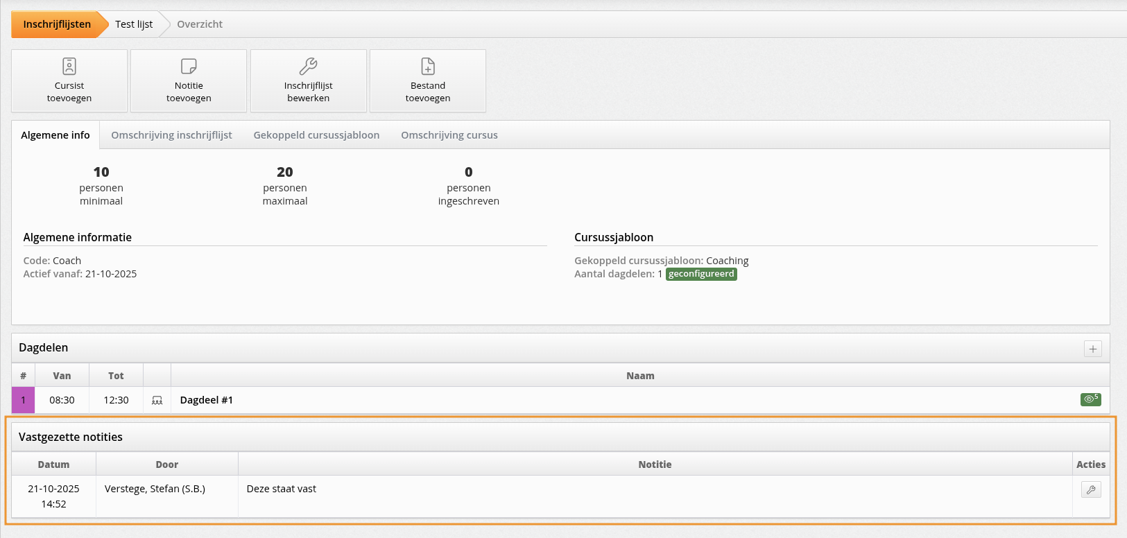 Net zoals bij een bedrijf en/of cursist kan je nu bij een inschrijflijst ook een notitie vastzetten! Mocht dit op meer plaatsen gewenst zijn horen we het natuurlijk graag