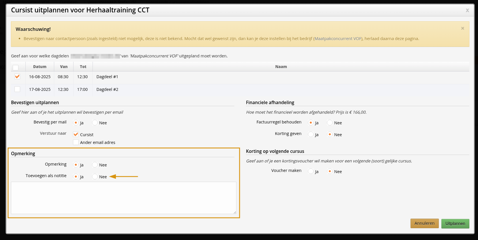 Bij het uitschrijven van een cursist is het mogelijk een optionele opmerking toe te voegen. Deze kan gebruikt worden in de communicatie naar de cursist, maar verders kon je er niks mee.